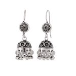 Antique Oxidized Flower Blue Jhumkis in 925 Sterling Silver. Oxidized Sterling silver gives natural look to the piece and can make it look rustic and antique. The jhumkis are traditional earrings and they look completely divine on your ethnic wear. Base metal is sterling silver and it is perfect for daily wear or party wear.