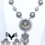 Antique Oxidized Radha Krishna Neckalce Set with Radha Krishna painting in center looks beautiful with traditional wear. The antique oxidized necklace is handcrafted in sterling silver and is nickel and lead free.